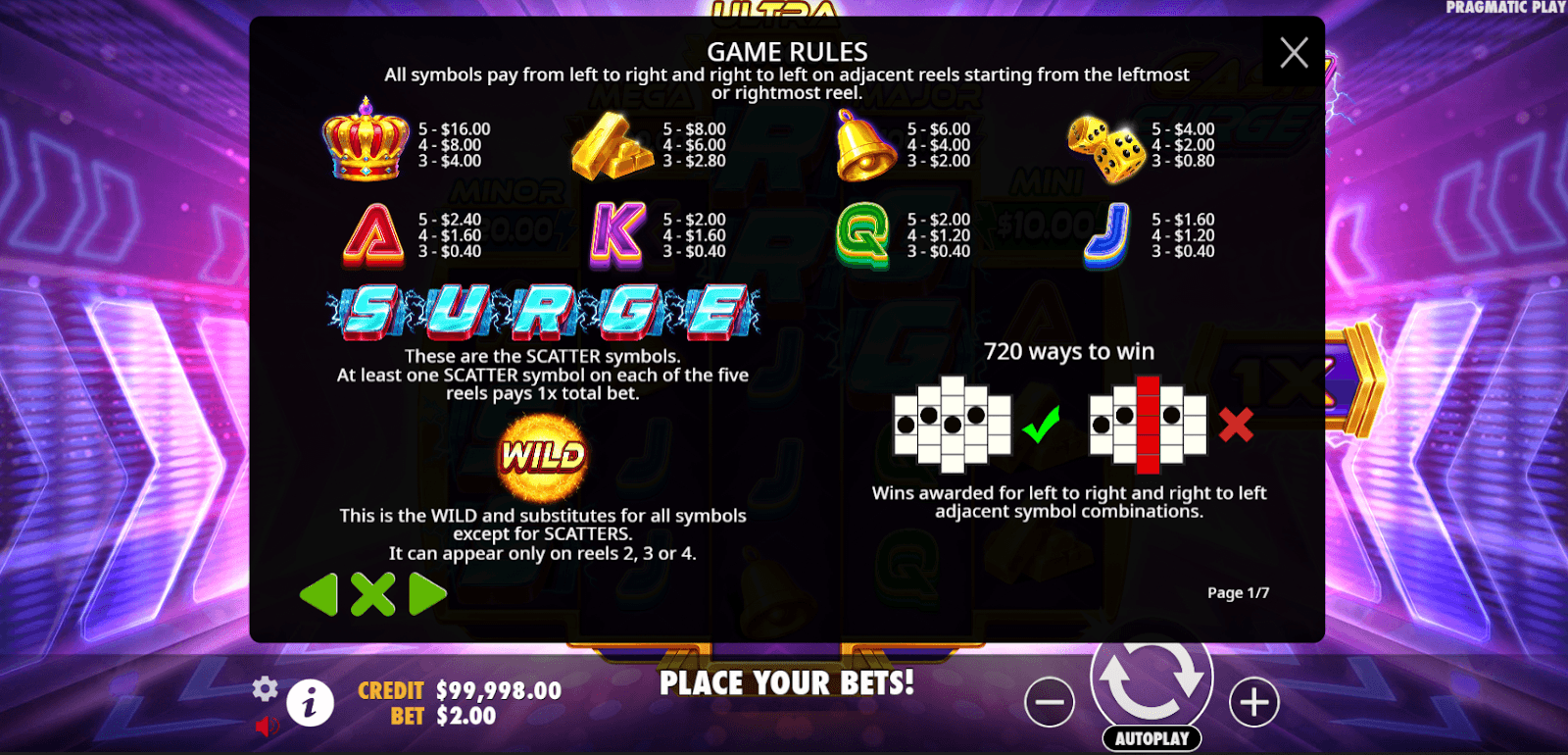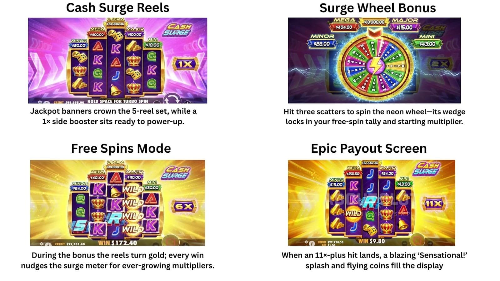 - SURGE Freispiele — Sammle die Buchstaben S-U-R-G-E, um vier Spins freizuschalten, bei denen alle aktuellen progressiven Symbole gesperrt sind; zusätzliche Buchstaben fügen +1 Spin hinzu und Blitze erhöhen die Preise weiter.